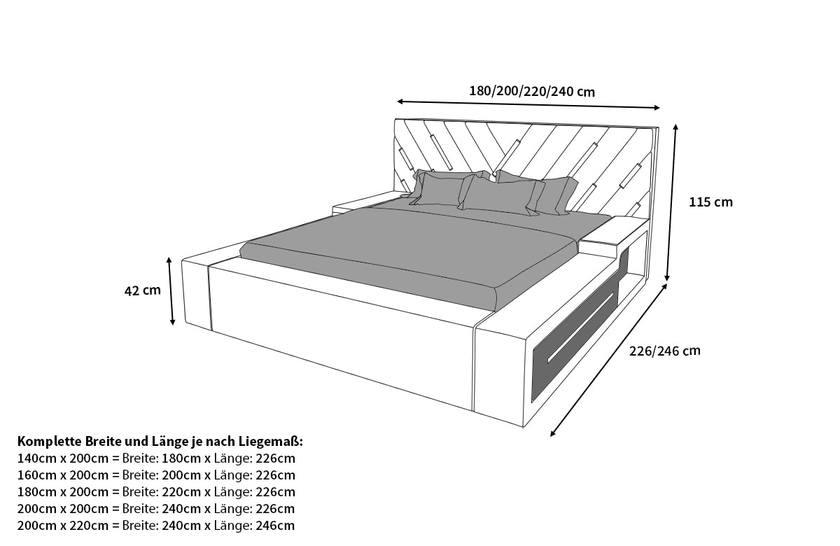 Bitte beachten Sie, dass dieses Bett standardmäßig ohne Matratze und Lattenrost geliefert wird. Sie können jedoch optional über das Dropdown-Menü entscheiden, ob Sie das Designerbett mit einem Lattenrost oder sowohl mit einem Lattenrost als auch einer Matratze bestellen möchten. Die Größe wird dabei automatisch an das von Ihnen gewählte Liegemaß angepasst.