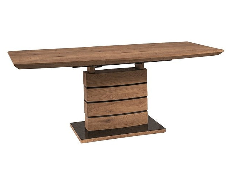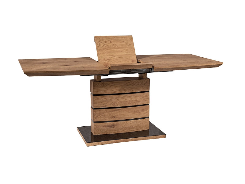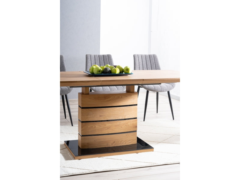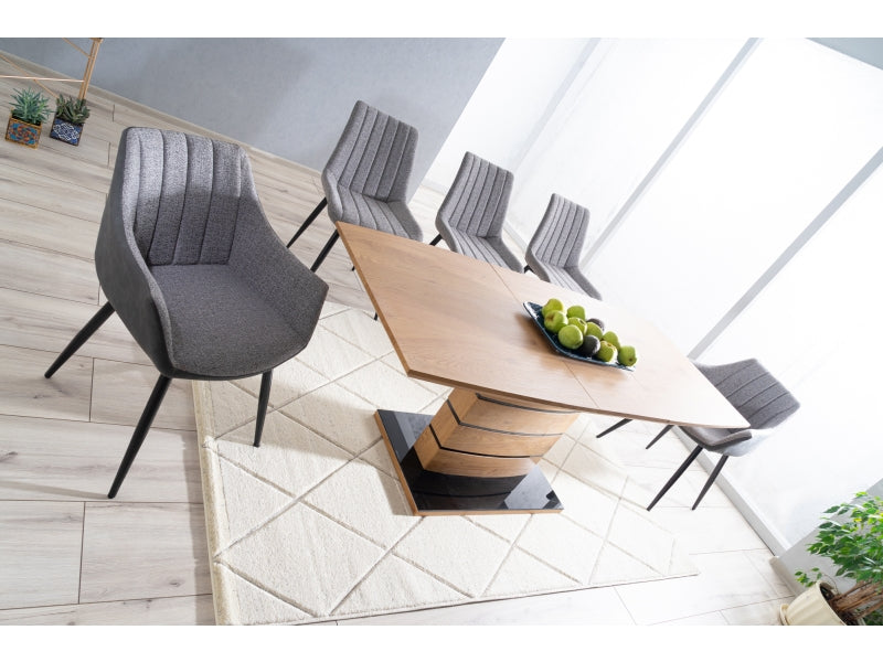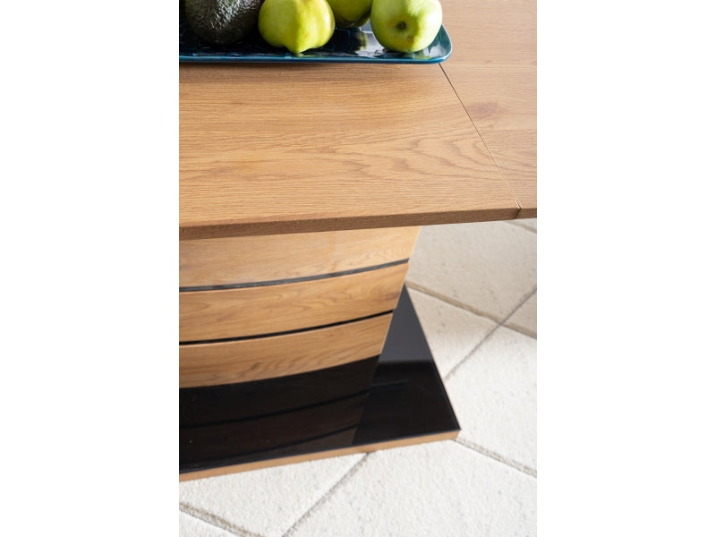 Gestell: Das Gestell des Esstisches Leonardo Eiche besteht aus einer Kombination von MDF und Glas, wodurch der Tisch sowohl Stabilität als auch eine moderne Optik erhält. Die Farbkombination aus Eiche und Schwarz setzt Elegance Akzente.