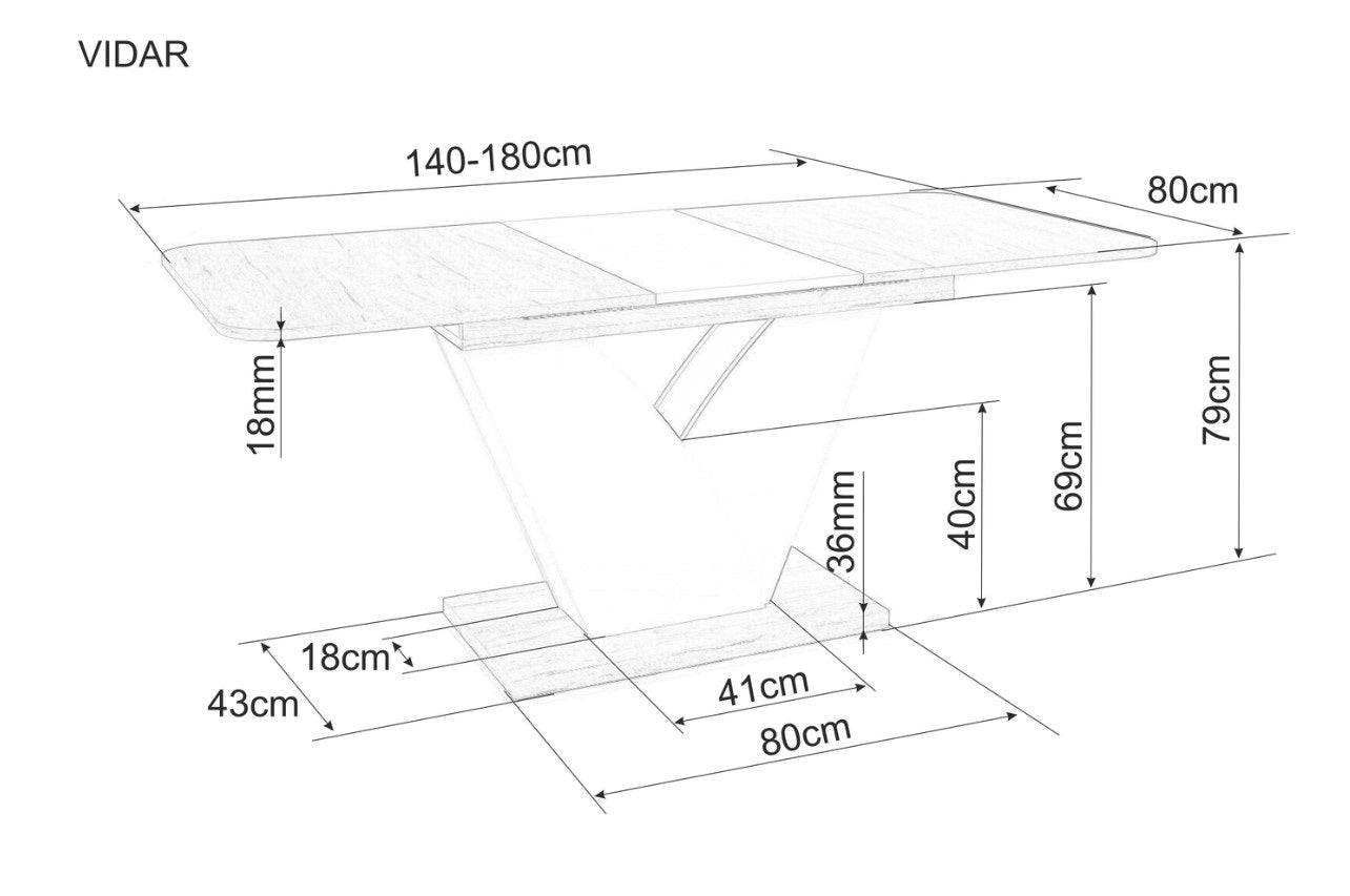 Maße: Mit einer Höhe von 79 cm, einer Tiefe von 80 cm und einer Breite von 140 cm (ausziehbar bis 180 cm) bietet der Esstisch Vidar genügend Platz für gesellige Mahlzeiten und Zusammenkünfte.