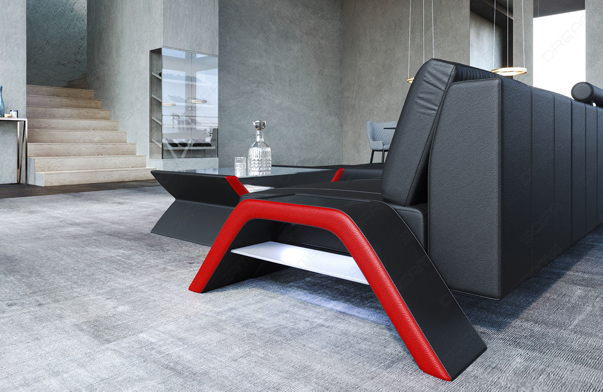 Das Esmeralda Ecksofa in Leder ist ein echtes Highlight unter den Designersofas. Zahlreiche Details machen dieses Sofa zu einem besonderen Blickfang. Die auffällig gestaltete Armlehne mit einer großen Ablagefläche in schwarz Hochglanz fällt sofort ins Auge. Diese kann zusammen mit der Ottomane wahlweise rechts oder links positioniert werden. Unter der Elegancen Armlehne befindet sich eine moderne LED-Beleuchtung, die sowohl das Sofa als auch die Armlehne perfekt in Szene setzt. Auf der gegenüberliegenden Seite gibt es ebenfalls eine stilvolle Armlehne mit praktischem Stauraum. Hier können Sie ebenfalls Getränke, Snacks oder andere Dinge auf einer praktischen Ablagefläche abstellen. Die großzügige Ottomane lädt dazu ein, sich nach einem langen Arbeitstag auszubreiten und zu entspannen, ohne gleich ins Bett gehen zu müssen. Wählen Sie aus einer Vielzahl an Haupt- und Nebenfarben, sodass garantiert auch die perfekte Farbe für Sie dabei ist. Gestalten Sie Ihr Traumsofa aus Leder bei Rayy ganz nach Ihren Vorstellungen, mit dem passenden Material, der gewünschten Farbe und der idealen Ausrichtung. Ganz zu schweigen von den optionalen Extras wie einem USB-Anschluss oder der Multifunktionskonsole, wird das Ecksofa Esmeralda definitiv der Hingucker in Ihrem Wohnzimmer! Passende Zierkissen sind ebenfalls optional erhältlich.