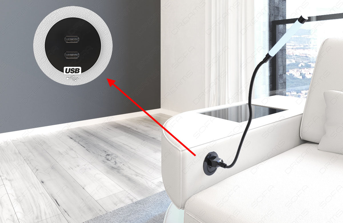 • Optionaler USB-Anschluss in der Armlehne mit LED-Leselampe (auf Anfrage auch auf beiden Seiten verfügbar)