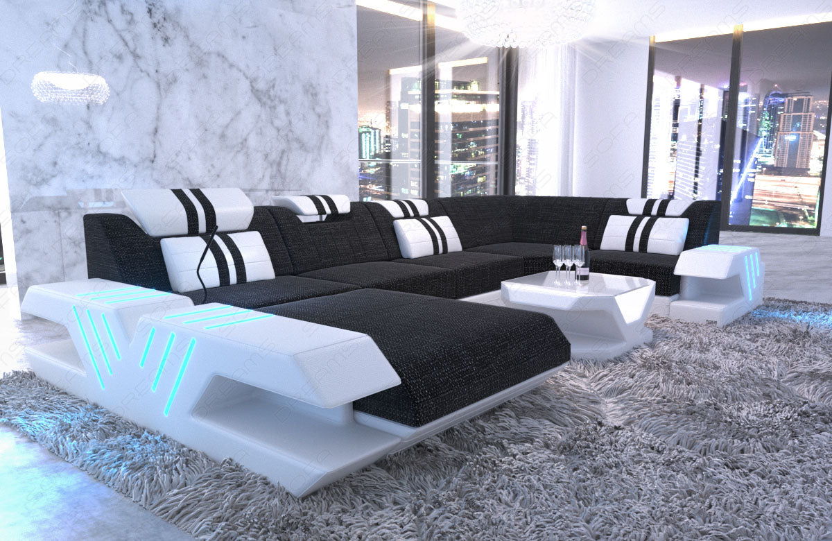 Unsere Elegance und moderne Polsterecke Venezia in U-Form wird in jedem Wohnzimmer zum Blickfang. Das Sofa beeindruckt mit einem stilvollen Mix aus Stoff und Leder sowie der exklusiven LED-Beleuchtung an den Armlehnen. Die Polsterecke besteht aus einer Schicht Polyether-Kaltschaumfüllung, die für hohen Komfort sorgt, während der Bonell-Federkern für Stabilität sorgt und Verformungen vorbeugt. Das stabile Gestell aus robustem Buchenholz ist besonders langlebig und widerstandsfähig gegen Risse. Im Lieferumfang sind drei Kissen enthalten, die perfekt zur Couch passen. Die genauen Maße der Polsterecke entnehmen Sie der beigefügten Zeichnung.