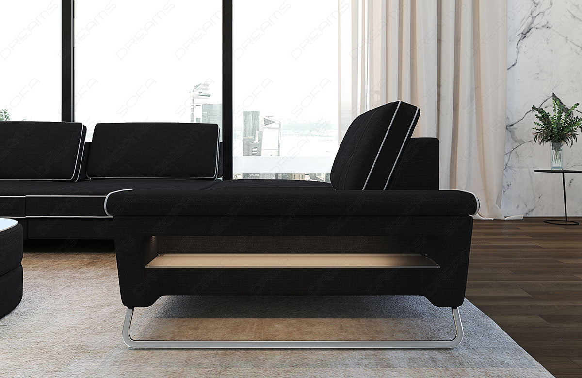 Die Polster-Wohnlandschaft Lari U-Form überzeugt mit Elegancen Chromfüßen und einer Kombination aus Stoff- und Lederbezügen. Das moderne Design und der Materialmix machen dieses Sofa zu einem stilvollen Highlight in jedem Wohnzimmer. Besonders hervorzuheben ist die RGB-LED-Beleuchtung, die für eine angenehme Atmosphäre sorgt und bequem über eine "Touch-Wheel"-Fernbedienung steuerbar ist. Sie können das Sofa ganz nach Ihren Wünschen gestalten. Wir bieten drei verschiedene Stoffarten an: Der Strukturstoff Hugo besticht durch seine edle Optik und ist sowohl gemütlich als auch pflegeleicht. Mit einer Verschleißfestigkeit von über 30.000 Zyklen ist er zudem besonders robust. Der Mikrofaserstoff Mineva zeichnet sich durch seine besondere Struktur und die einfache Fleckenentfernung aus, die mit einem feuchten Tuch ganz leicht gelingt. Trotz seiner hohen Widerstandsfähigkeit von über 75.000 Zyklen bleibt der Stoff angenehm weich. Der Webstoff Sun Velvet fühlt sich wie Samt an und bietet eine hohe Verschleißfestigkeit von über 50.000 Zyklen. Zudem verfügt das Sofa über eine praktische Mittelkonsole (optional), die eine elektrisch ausfahrbare Steckdosenleiste, 2 USB-Anschlüsse und ein verchromtes Schubfach mit einer beweglichen Platte in schwarzem Hochglanz enthält.