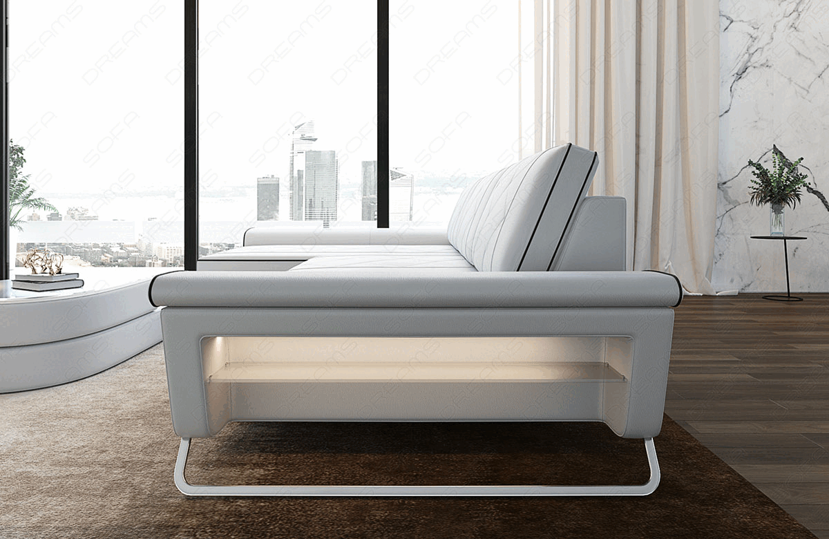 Schlank. Stilvoll. Clever. Dieses atemberaubende weiße Naomi-Sofa ist nicht nur ein Möbelstück, sondern ein Statement. Mit LED-Leuchtpaneelen und Chrombeinen wertet es Ihren Raum sofort auf.