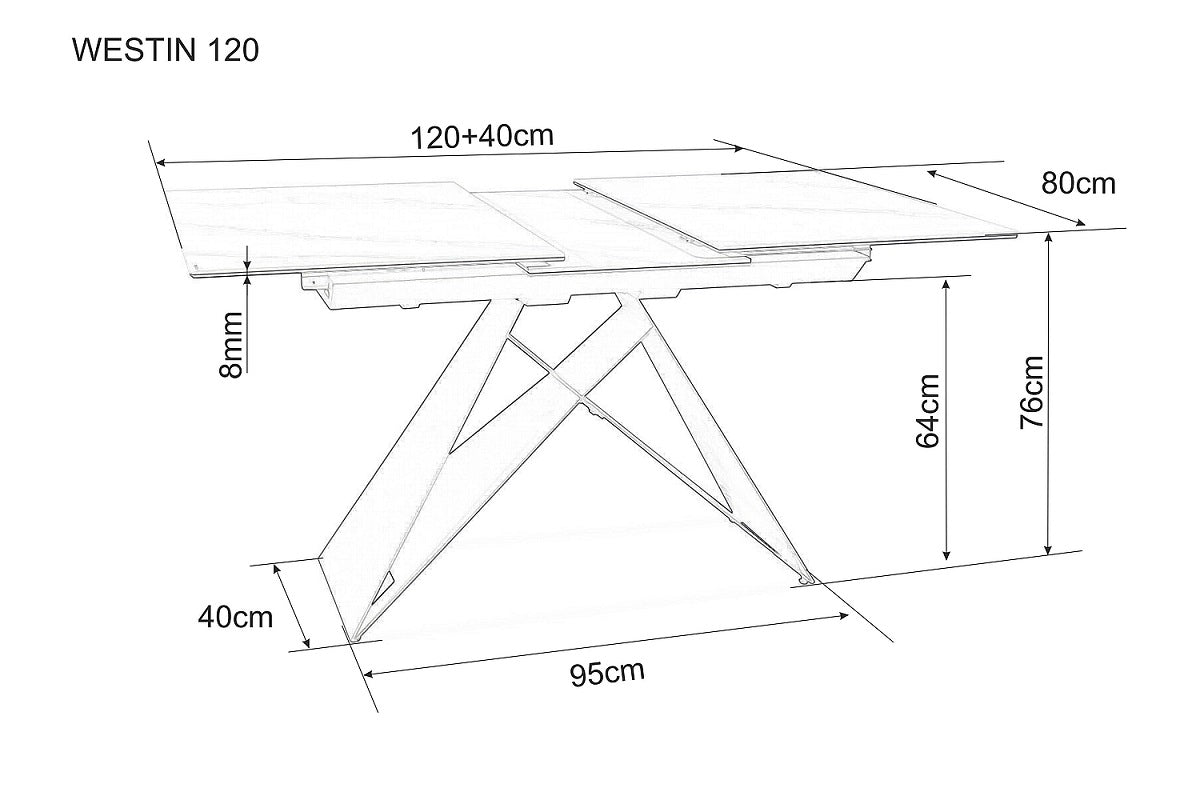 Larghezza: 120 cm, estensibile fino a 160 cm x Altezza: 76 cm x Profondità: 80 cm
